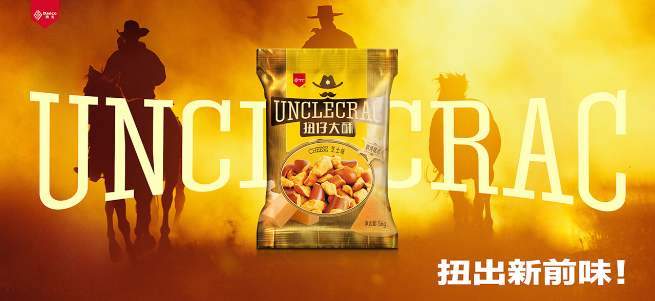 扭仔大酥、扭仔小结,是丹夫集团旗下伯力爵公司在2018年推出的两款系列性新品,是源自于美国经典食品“Pretzel”,通过口味加工,研制成适合中国人口味的新型零食。由于产品在国内市场未曾出现,我们在思考其品牌形象及包装时,希望能将产品形态、产品地域文化和口感结合,达到品牌即品类的目标,占据市场。所以结合产品“扭曲”的形态,与美国西部文化的特色,为其命名为“扭仔大酥”、“扭仔小结”。在品牌形象创作时,也与产品形态、西部牛仔特色相结合。整体色调偏昏黄,契合西部片的调性,营造一种市场独特的印象。